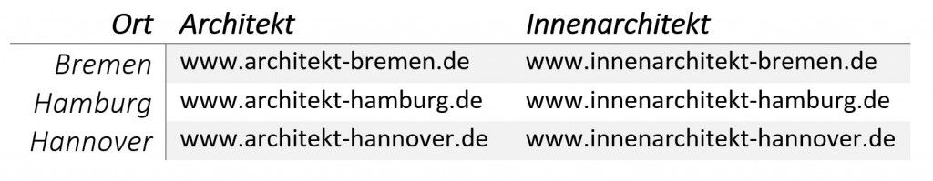 Verdeutlichen wir uns dies an einem letzten Beispiel: eine Architekturfirma, die in Norddeutschland sowohl Gebäude- als auch Innenarchitekturanbietet. Wer nun in Bremen nach einem Innenarchitekten sucht, wird vermutlich auch „Innenarchitekt Bremen“ bei Google eingeben. Und wer ein individuelles Haus bauen möchte, sucht vermutlich nach einem „Architekt Bremen“. Mit ihrer Domainstruktur können Sie sich dem Suchverhalten Ihrer Kunden anpassen – auch Google wird es Ihnen danken.