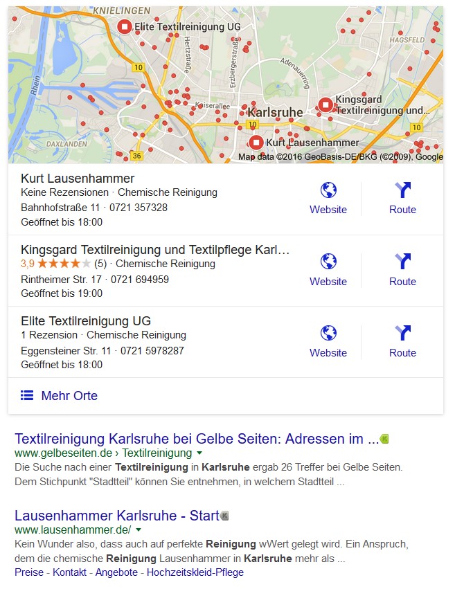 Noch vor den eigentlichen Suchergebnissen zeigt Google bei lokalen Suchen nämlich eine Karte an, auf der mehrere Unternehmen verzeichnet sind (siehe Infografik zum Beispiel „Reinigung Karlsruhe“). Je mehr Informationen hier über Sie zu finden sind, desto besser für Sie! Wenn Sie hier auch noch positive Rezensionen erhalten, werden Sie nicht nur Google überzeugen können, dass Sie in Ihrem Tätigkeitsfeld die Autorität in Ihrer Stadt sind.